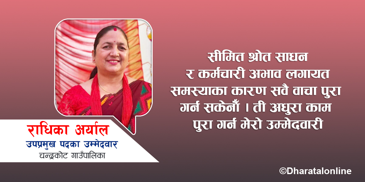 चन्द्रकोट गाउँपालिकामा पहिलो कार्यकाल सफल बनाएर स्थापित राधिका अर्याल सोही मध्येकी एक उम्मेदवार हुन् । प्रस्तुत छ उनीसंग धरातल अनलाईनले गरेको संवाद